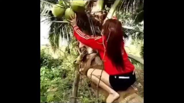 สาวขึ้นเก็บ มะพร้าว หวาดเสียวไม่กล้าดู ถลอกหมดแล้วหนู