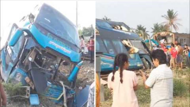 คลิประทึก!! วินาทีรถทัวร์ตัดหน้ารถไฟ ชนกันสนั่น ( News )
