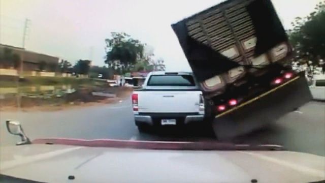 คลิปอุบัติเหตุ รถบรรทุกเสียหลักพลิกคว่ำทับเก๋ง กระบะโชคดีรอดหวุดหวิด